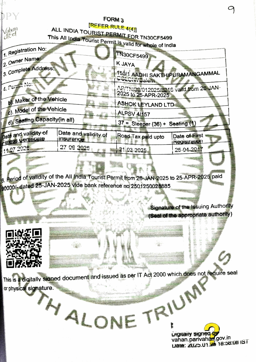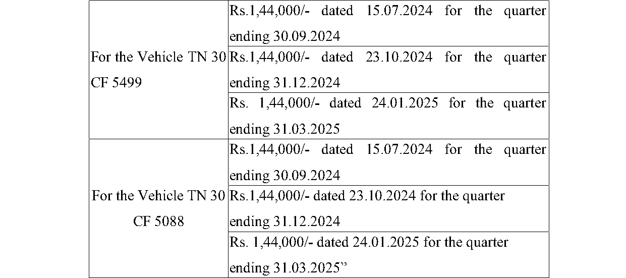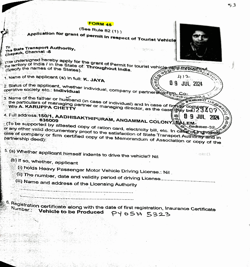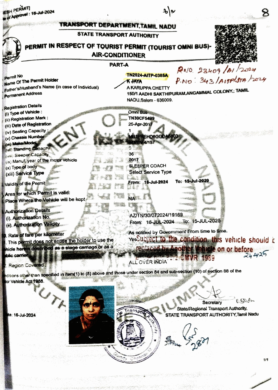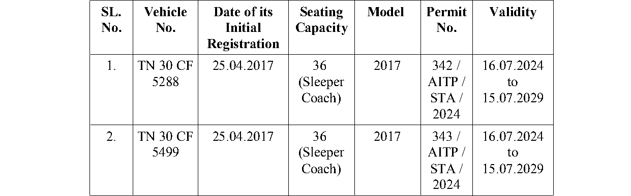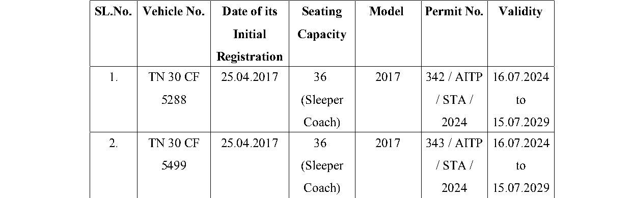 2. The case of the petitioner is that she is the owner of the Contract Carriage Vehicles bearing Registration Nos.TN-30-CF-5288 and TN-30-CF- 5499, which are covered by a valid All India Tourist Permit granted by the 3rd Respondent herein. The base permits in respect of the said vehicles are valid from 16.07.2024 to 15.07.2029 to ply all over the Union of India. 3. The grievance of the petitioner is that the 2nd and 3rd Respondents herein had additionally stamped a condition onto the permits of the petitioner's vehicles stating that both of the vehicles should be replaced by other vehicles on or before 24.04.2025. Aggrieved by the imposition of the said condition, the petitioner has come up with the present writ petition. 4. The learned counsel for the Petitioner submits that Rule 4(5) of the All India Tourist Vehi