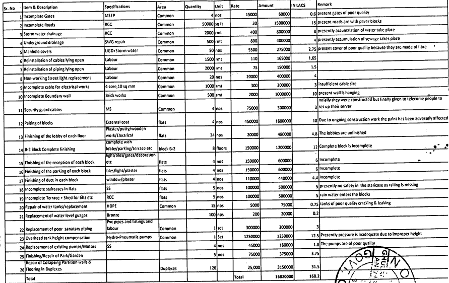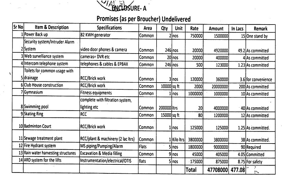 "a) The opposite parties may therefore be jointly and severally directed to provide the facilities promised by them and to remove the deficiencies pointed out hereinabove and in Enclosure A &B to the satisfaction of the compiainant-society or in alternate they be directed to pay the amount of Rs. 6,45,28,000/- (Rupees Six Crores Forty Five Lakhs Twenty Eight Thousand Only) calculated and shown in Enclosure A & B.