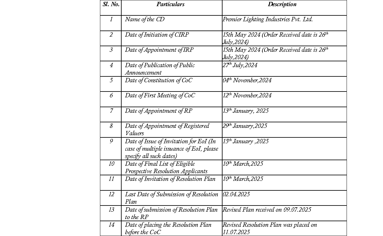 1. The present Application is filed by Vishnu Kant Kabra, Resolution Professional (“Applicant/Resolution Professional”) of Premier Lighting Industries Private Limited (“Corporate Debtor”) under Section 30(6) read with Section 31(1) of the Insolvency and Bankruptcy Code, 2016 (“Code”) read with Regulation 39(4) of the Insolvency and Bankruptcy Board of India (Insolvency Resolution Process for Corporate Persons) Regulations, 2016 (“CIRP Regulations”) read with Rule 11 of the National Company Law Tribunal Rules, 2016 for seeking approval of the Resolution Plan dated 09.07.2025 along with addendum to