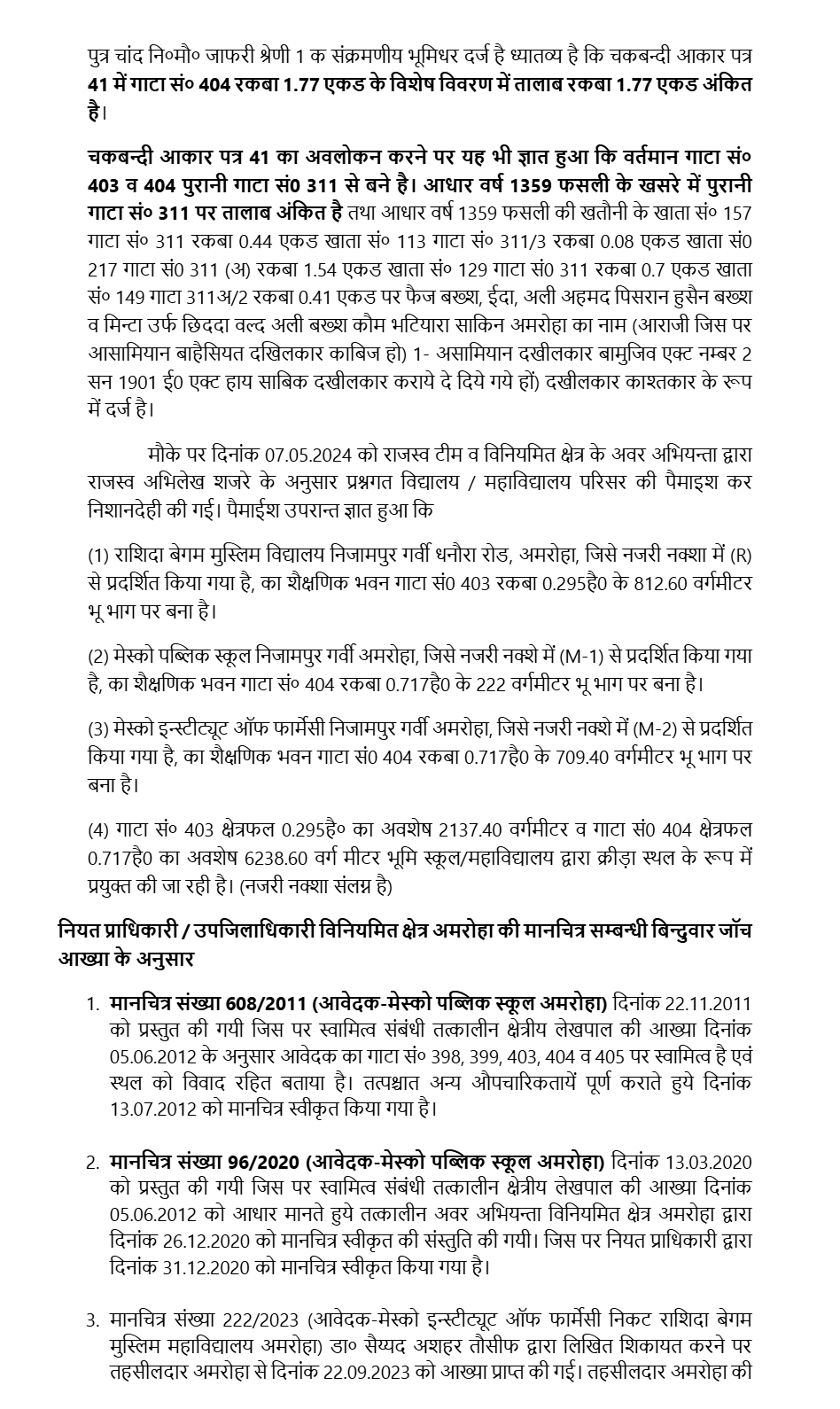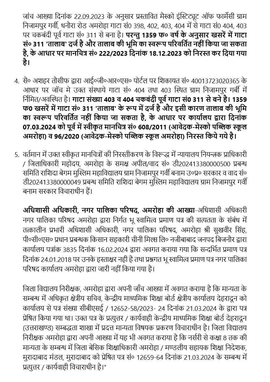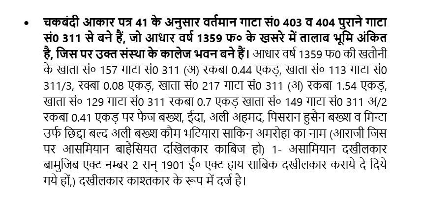 2. Further allegation is that Gata No. 403 and 404 (earlier Gata No. 311 prior to Chakbandi) is a Talab (pond) and is registered as a Talab in the revenue record 1359 fasli year. It is further alleged that on the basis of the fabricated document of the Municipal Council Amroha the recognition was obtained by above institutions in the year 2018.