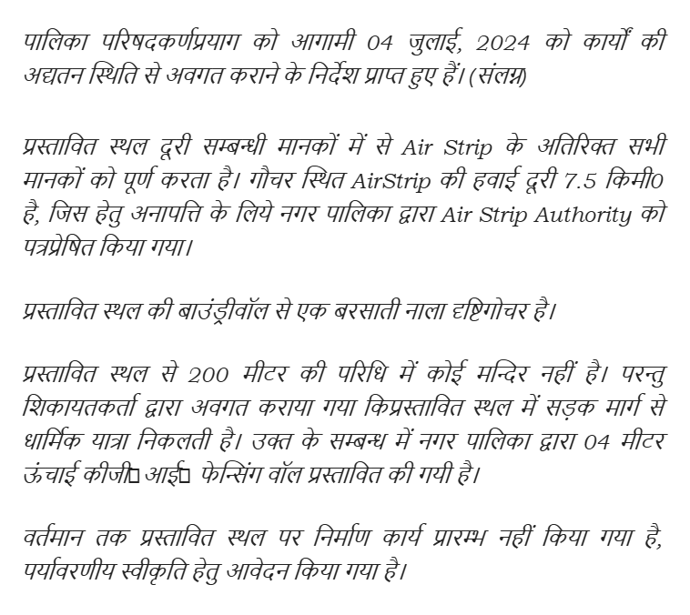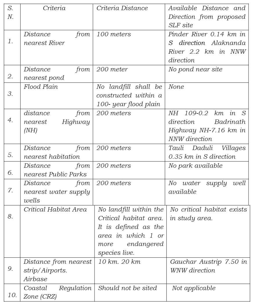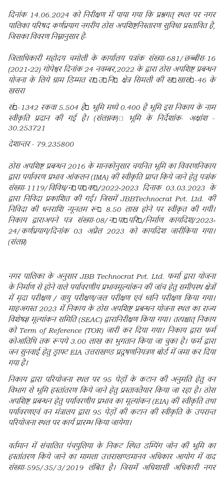 2. Complainants have said that Nagar Palika Parishad, Karanprayag, District Chamoli, a local body, is establishing a Solid Waste Disposal Centre at a motorable road of Movani Ghadere (springs) at Karanprayag Nanisain Road in utter violation of siting criteria provided in environmental laws; site is just about 100 meters from Pindar river and entire leachate will get discharged in the said river polluting the same. The site is also in rural area and likely to cause environmental damage and health hazard to local residents.