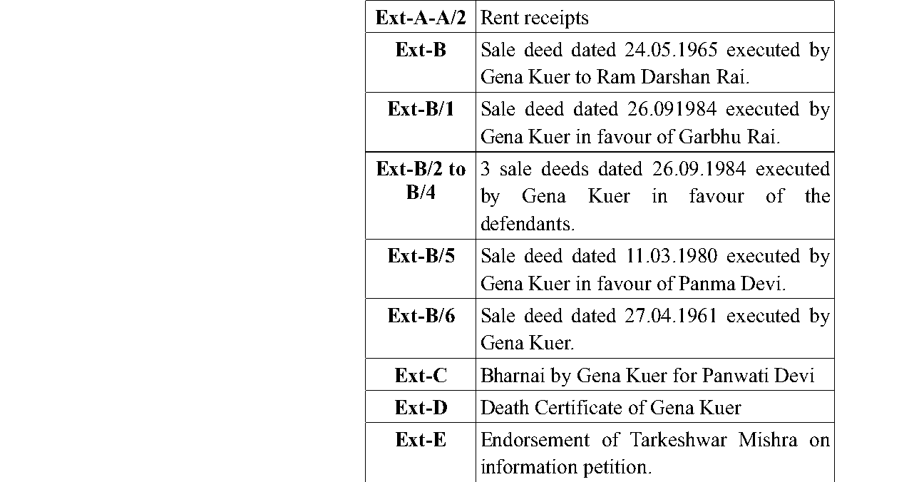 3. The respondents/plaintiffs have filed a suit with a relief to declare void the four sale deeds dated 29.06.1984 executed by Gena Kuer in favour of Mishri Lal Rai, Upendra Rai and Tej Narayan Rai and Smt. Fulmati Devi, Garmu Rai and Paano Devi and for other reliefs.