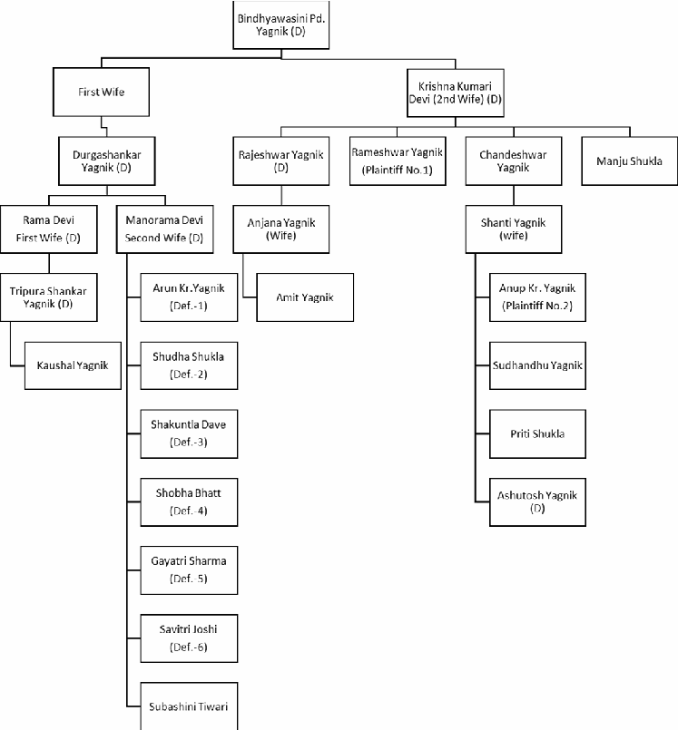5. As per the plaint, Bindhyawasini Pd. Yagnik (Jani) @ Bacchan Babu was common ancestor who died leaving behind Smt. Krishna Kumari Devi, his second wife from whom three sons and one daughter namely Rajeshwar Pd. Yagnik @ Babu Saheb, Rameshwar Pd. Yagnik @ Lall Sahab (P-1) and Chandeshwar Pd. Yagnik @ Kunwar Saheb and a daughter Manju Yagnik (Shukl