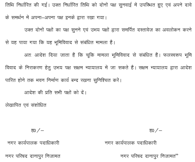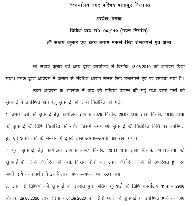 The petitioner seeks quashing of the order dated 04.09.2020, bearing Memo No.1674, passed in Miscellaneous Case No.04 of 2019 (Building Construction) by the City Executive Officer, Nagar Parishad, Danapur Nijamat, Patna (Respondent No.6), disposing of the case filed by Sanjay Kumar (Respondent No.10). By the said order, the Executive Officer has issued a direction to stop the petitioner’s building construction work till adjudication of title by a Civil Court of competent jurisdiction.